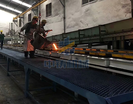 1、全自動造型機(jī)打出來砂型直接在鏈板線上循環(huán)輸送,可以是單排雙列,也可以雙排雙列;